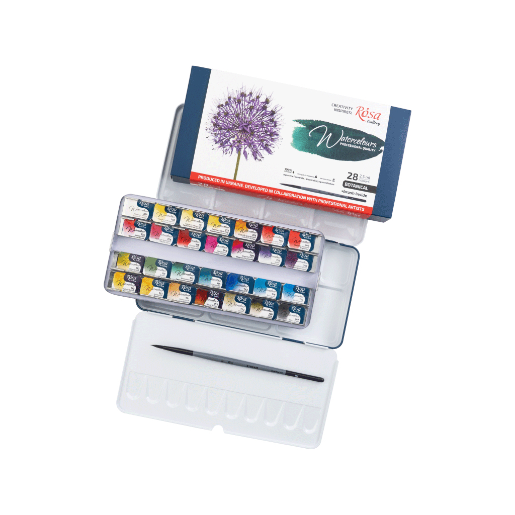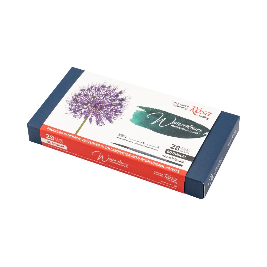 Набір професійних художніх акварельних фарб Botanical на 28 кольорів призначений для поціновувачів ботанічної ілюстрації. Повітряність та багатошаровість, що властиві ботанічній ілюстрації, забезпечуються прозорістю акварельних фарб. Чистота у сумішах досягається домінуванням у палітрі однопігментних кольорів. Набір професійних художніх акварельних фарб Botanical від ROSA Gallery поєднав у собі саме ці властивості.