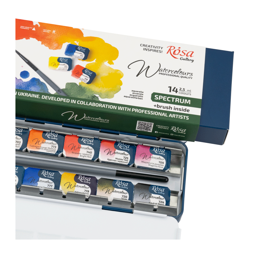 В набір входить акварельний пензель з синтетичного волосу, який відмінно вбирає та віддає вологу.Характеристики професійних акварельних фарб ROSA Gallery в наборах: - Натуральний гуміарабік забезпечує відмінну адгезію та рознесення акварельних фарб - Тонкотерті натуральні та синтетичні пігменти гарантують максимальну чистоту та прозорість фарб - Висока концентрація пігменту дозволяє отримати широку розтяжку кольору від максимально насиченого до повітряно прозорого - Класична технологія природнього сушіння акварелі забезпечує її легке розчинення водою та набір фарби на пензель - В металевий пенал вбудовані дві палітри різної конфігурації, спеціальна вставка для кювет та зручний фіксатор для пальця, що дозволяє легко утримувати набір фарб у руці під час роботи - Завдяки невеликому розміру пенал можна переносити у сумці або етюднику Завдяки стильному дизайну обгортки та металевому пеналу з кришкою-палітрою набори акварельних фарб ROSA Gallery в кюветах стануть вишуканим подарунком для професійного художника.