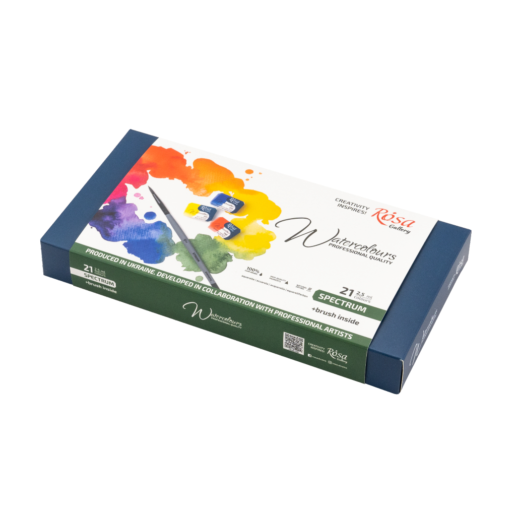 Набір професійних художніх акварельних фарб SPECTRUM поєднує у собі традиційні кольори для техніки акварель. більшість кольорів гами - однопігментні, що дає можливість утворювати чисті віддінки при зммішуванні.