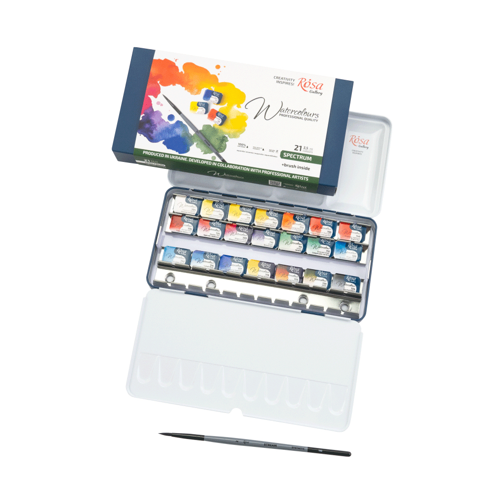 Акварельні фарби Rosa Gallery SPECTRUM, 21*2,5мл, з пензлем, кювета Індіго металевий пенал (4823098544777)