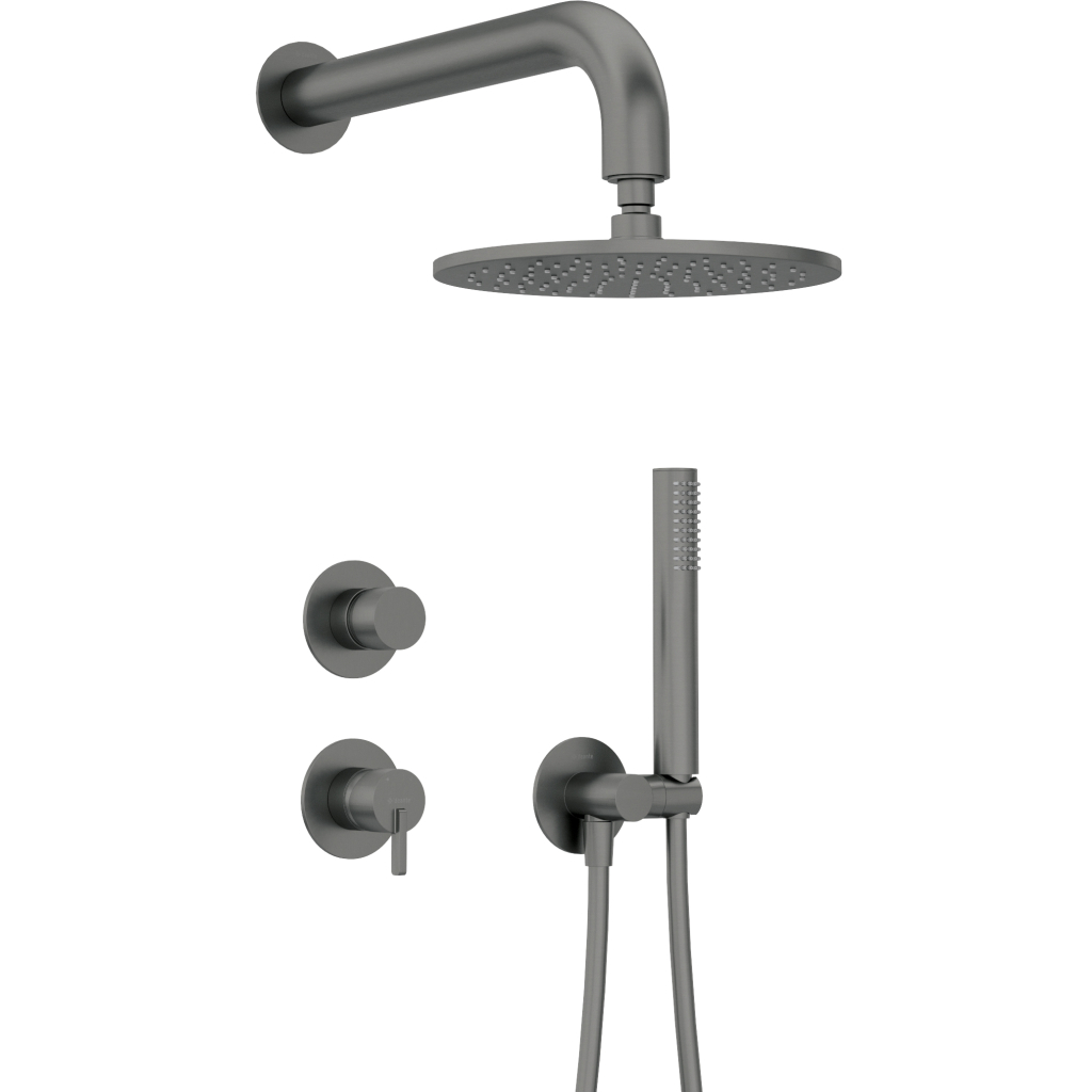 Набір для душу Silia прихованого монтажу з верхнім душем у кольорі титан — це втілення стилю та функціональності. Комплект включає змішувач із прихованим монтажем, верхній душ діаметром 250 мм, ручну лійку та душовий шланг довжиною 1500 мм із системою Anti-Twist. Завдяки технології Anti-Calc та функції Cool-Out забезпечується зручний догляд і безпечне використання.