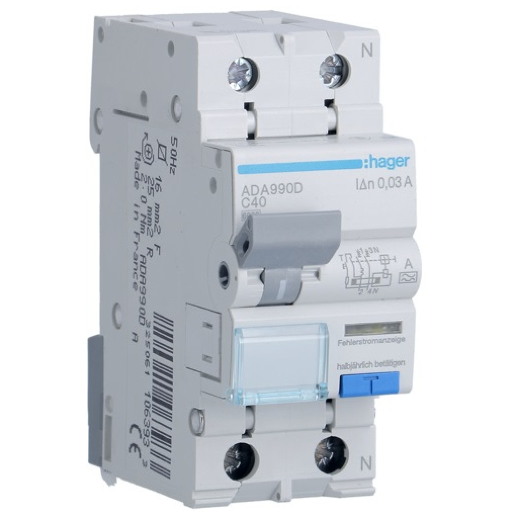 Диференціальний автоматичний вимикач Hager 1-п.+N 40A C 30mA (6kA) A (A) (ADA990D)