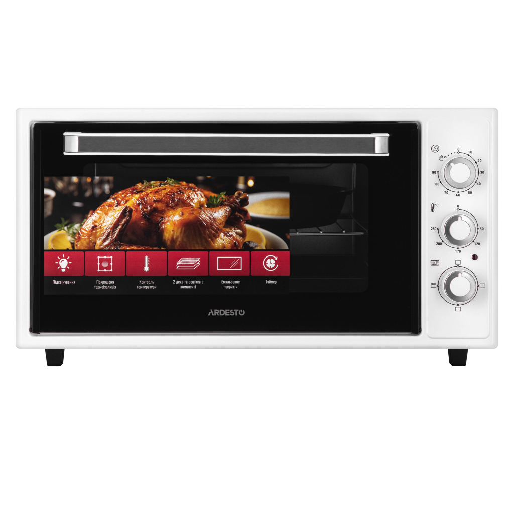 Електрична піч ARDESTO об’ємом 48 л має потужність 1 600 Вт, забезпечуючи рівномірне приготування за температури від 50 до 250 °C. Також наявні 4 режими приготування, таймер до 90 хв та індикатор завершення процесу, які допомагають точно контролювати час готування.