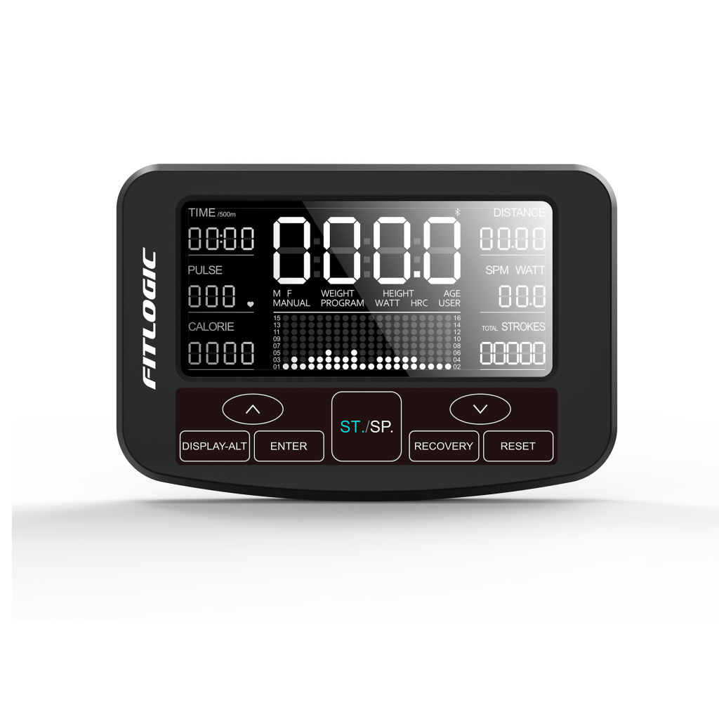 ФункціоналFitLogic R1901 оснащений LCD дисплеєм, який надає користувачам усі необхідні дані для моніторингу та аналізу тренування. Він відображає час тренування, темп на дистанції в 500 метрів, загальну пройдену дистанцію, пульс, кількість спалених калорій, кількість гребків за хвилину (SPM), загальну кількість зроблених гребків і потужність у ватах. Ці показники дають змогу відстежувати прогрес і ефективність тренувань у реальному часі, допомагаючи встановлювати й досягати конкретних результатів, а також підтримувати мотивацію та фокус на них.