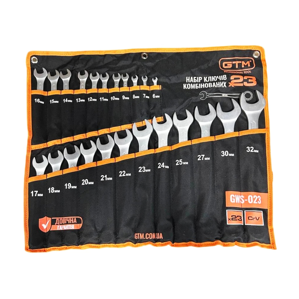 GTM GWS-023 - набір комбінованих гайкових ключів для закручування/викручування болтів, гайок та інших різьбових з'єднань. Даний набір поставляється в зручному тканинному чохлі, який дозволяє компактно зберігати їх як в багажнику автомобіля, так і на полиці в майстерні. Даний набір призначений для професійного застосування, але підійде також для роботи в побуті..