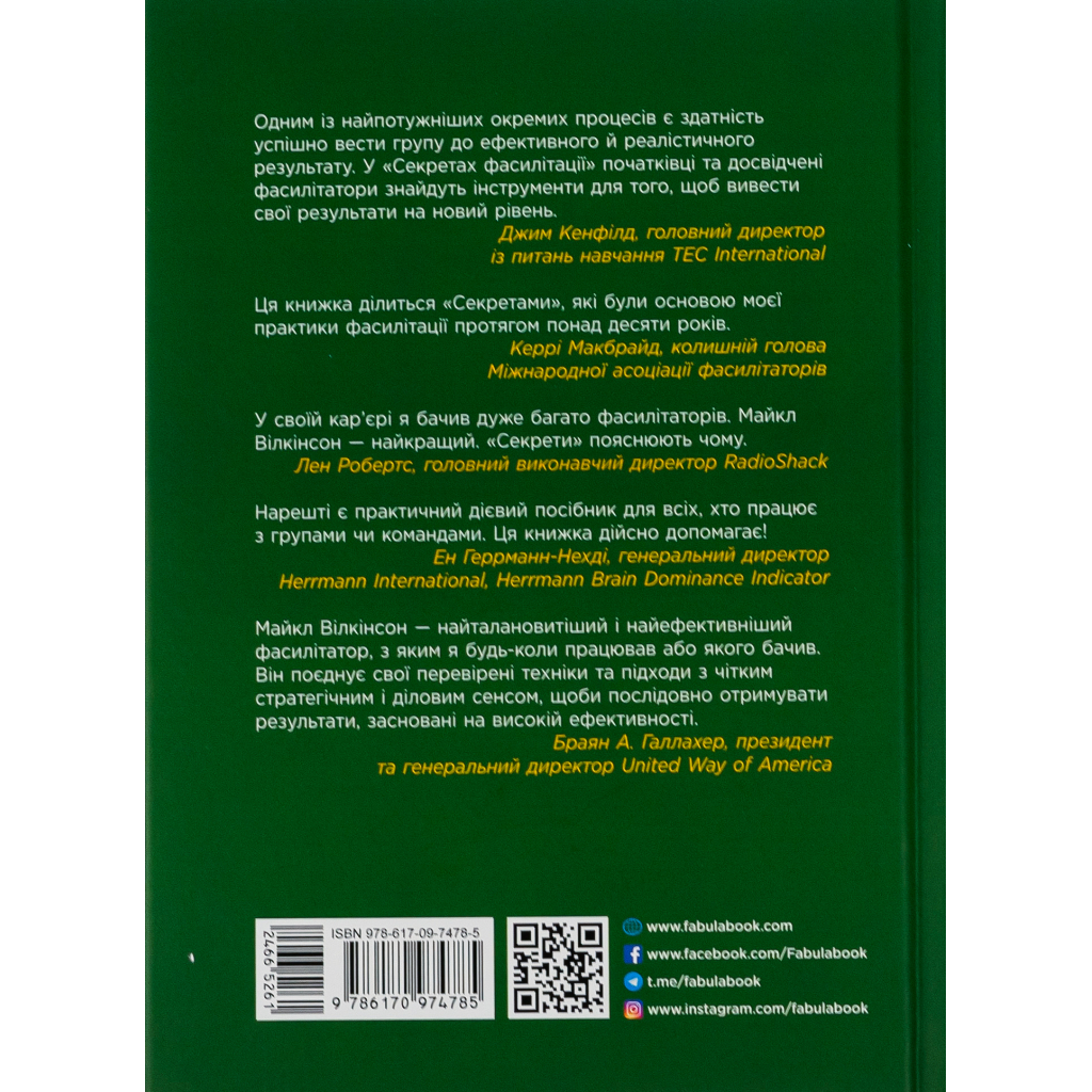 Оновлене видання «Секретів фасилітації» пропонує безліч цільових методів для фасилітаторів, які прагнуть до ефективних, послідовних та повторюваних результатів. Заснована на перевіреному підході Майкла Вілкінсона SMART (Structured Meeting And Related Techniques), книжка може допомогти досягти приголомшливих результатів під час управління, представлення, викладання, планування та продажу, а також інших професійних та особистих ситуацій. Це розширене видання містить нові розділи щодо організації віртуальних зустрічей, міжкультурних команд, а також великих груп та конференцій. Також у ньому є стратегії для залучення команд, додаткова інформація про підвищення продуктивності зустрічей та подальші вказівки щодо запобігання деструктивній поведінці. Крім того, книжка містить безліч свіжих тематичних досліджень та допоміжний вебсайт з обов'язковими інструментами та методами як для початківців, так і для досвідчених фасилітаторів.
