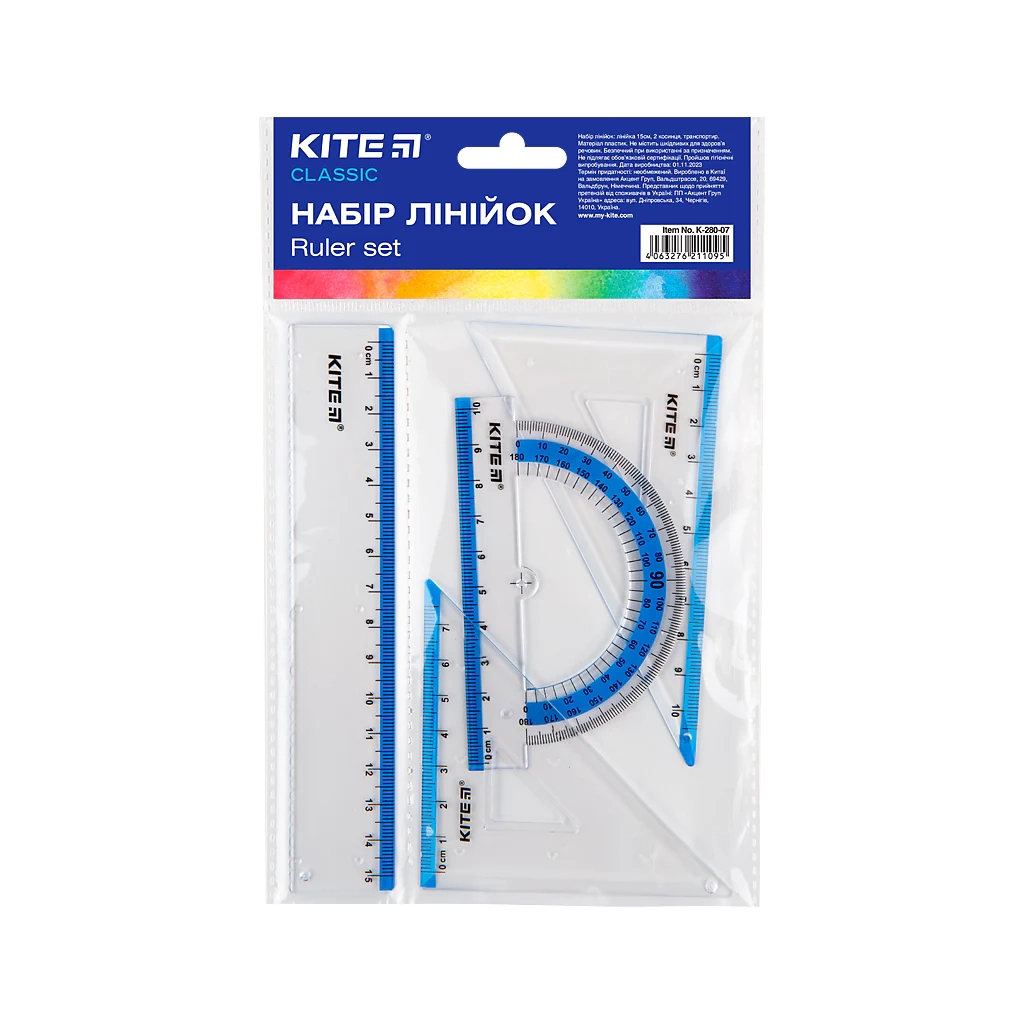 Лінійка Kite набір: лінійка 15 см, 2 косинця, транспортир (блакитна смуга) (K-280-07)