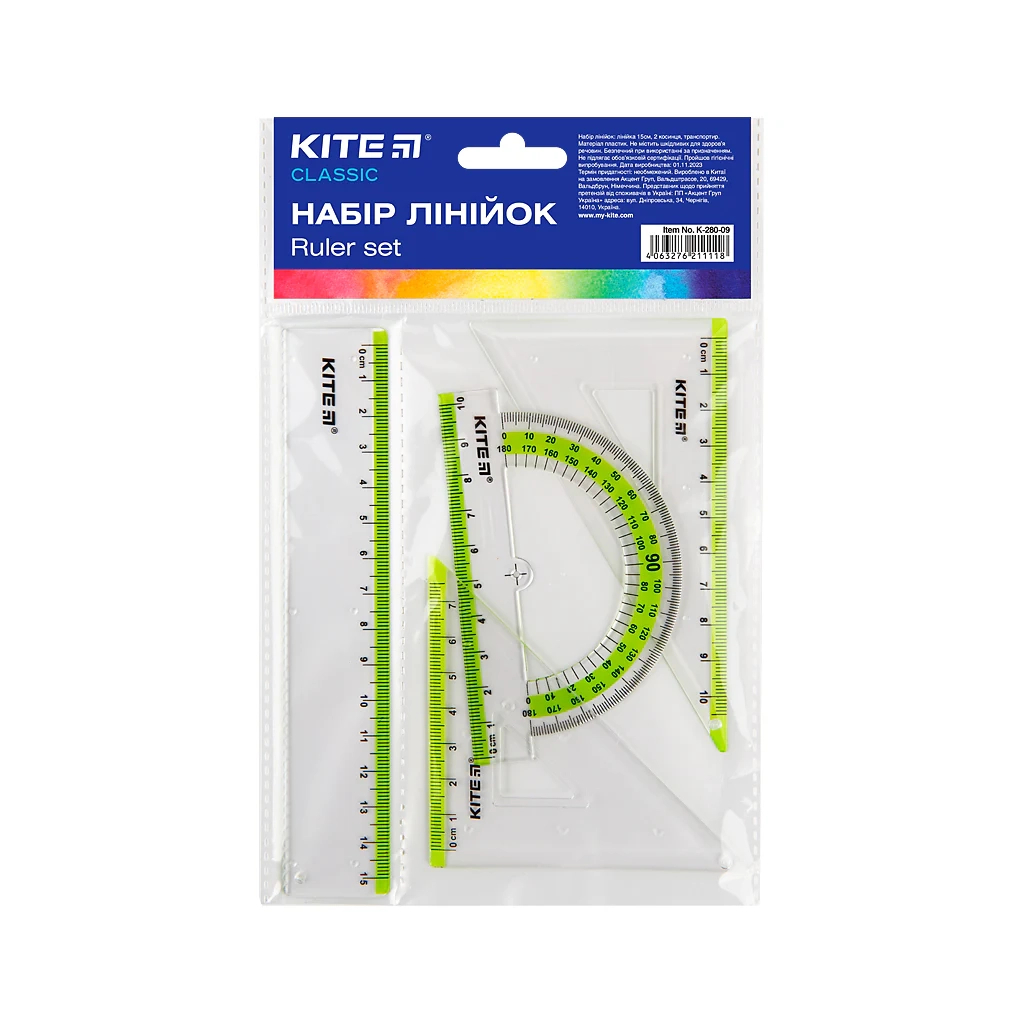 Лінійка Kite набір: лінійка 15 см, 2 косинця, транспортир (салатова смуга) (K-280-09)