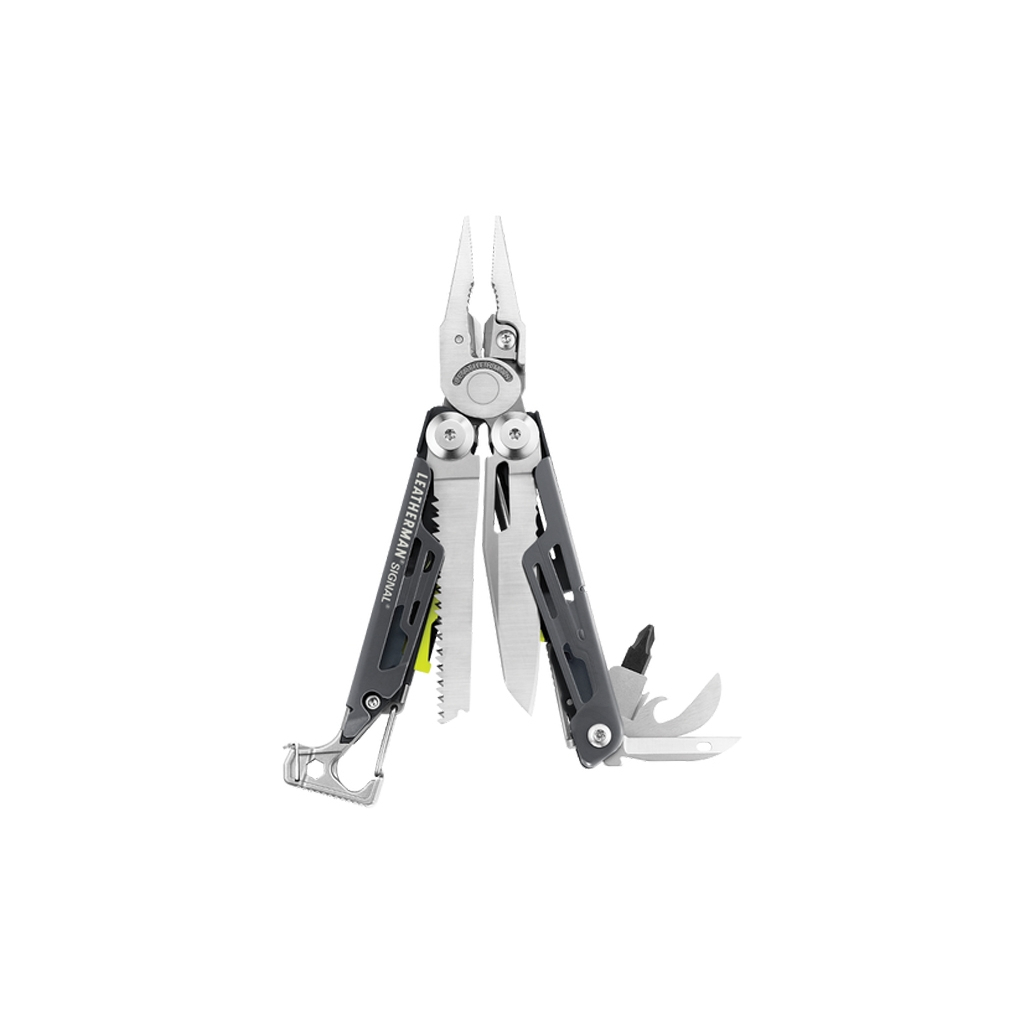 Універсальний мультитул для подорожей Leatherman Signal стане надійною опорою у суворих умовах дикої природи. Компактне складання цього набору включає 19 різноманітних інструментів, серед яких є унікальні - молоток, алмазне точило, екстрений свисток і кресало.