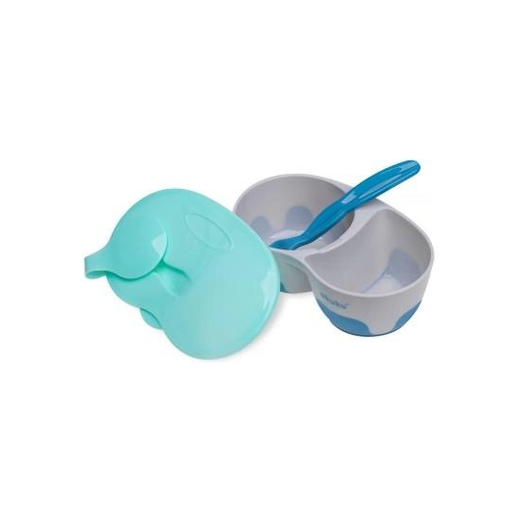 Практична двокамерна чаша – виріб, корисний на прогулянці чи подорожі. Два відділення дозволяють розділити вживання їжі. Виріб оснащений нековзним дном. На кришці чашки є спеціальна насадка для профільованої ложки. М'яка ложка не дратуватиме ніжні ясна дитини, її розмір і форма ідеально підходять для рота дитини. Виготовлено із безпечних матеріалів, призначених для контакту з харчовими продуктами, не містить бісфенолу А (0% BPA). Не використовуйте кришку під час розігріву в мікрохвильовій печі.