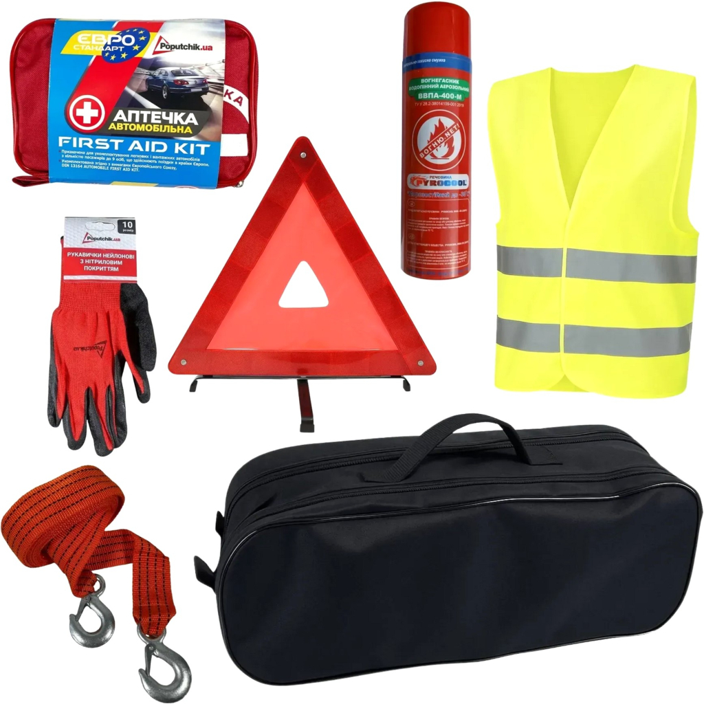 Набір автомобіліста Євростандарт з аерозольним вогнегасником – це практичний комплект, що містить усі необхідні предмети безпеки та швидкого реагування на шляху. Завдяки продуманій комплектації та зручній сумці-органайзеру ви завжди матимете під рукою потрібні аксесуари, а якісні матеріали гарантують тривалий термін служби набору.