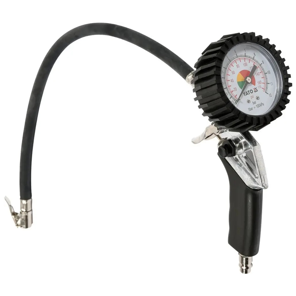 Пістолет для підкачки шин з манометром Yato YT-2370 необхідна річ для підкачки, контролю та стравлювання внутрішнього тиску в шинах автомобіля. Пістолет YT-2370 має вбудований манометр, за допомогою якого комфортно зчитувати показники тиску до 0,8МПа (8bar). При підключенні пістолета до зовнішнього джерела стисненого повітря, максимальний робочий тиск не повинен перевищувати 8кгс/см²(8bar). Манометра закріплений в гумовий корпус, для захисту від механічних пошкоджень. Корпус виконаний з алюмінію, високої якості, що забезпечить тривалий термін служби. Ергономічна ручка має компактну форму і покрита нековзним матеріалом. Гумовий шлаг, довжиною 40см, дозволяє приєднати пістолет до ніпеля в будь-якому положенні колеса. За рахунок швидкоз'ємного з'єднувача, розмір вхідного отвору 1/4"дюйма, можна швидко і легко приєднається до джерела подачі стисненого повітря. Даний пістолет, знайшов широке застосування не тільки автомайстерень, шиномонтажі але і на високоточному виробництві.