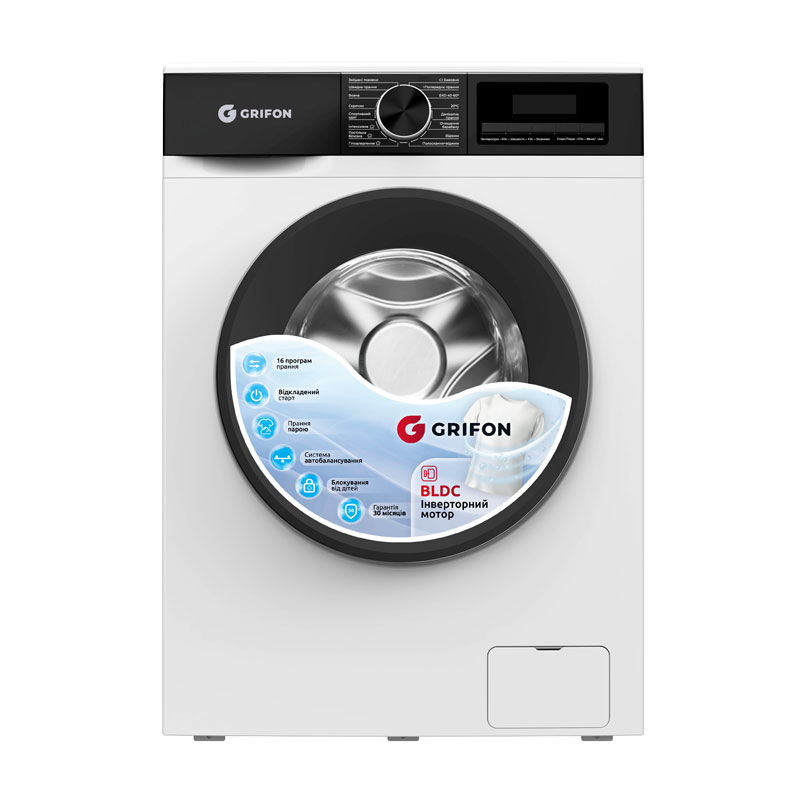 Grifon GWM-8121IWB - містка фронтальна пральна машина на 8 кг з інверторним двигуном та енергокласом A+++. Це надійна техніка для сім'ї, яка поєднує економічність, зручність та широкий вибір програм прання.