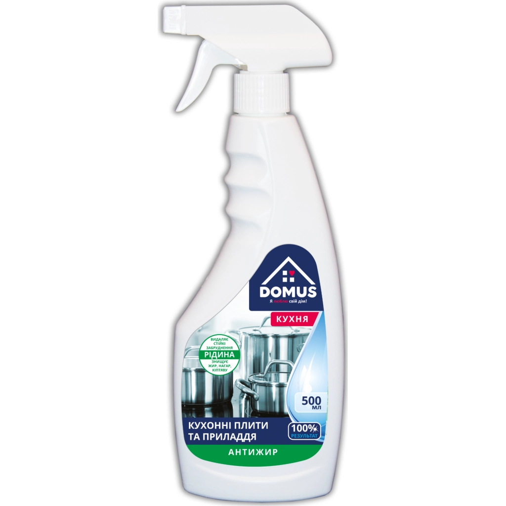 Засіб для видалення забруднень, жиру, кіптяви, нагару Domus швидко та ефективно видалить стійкі жирові забруднення, нашарування кіптяви та накипу з поверхонь кухонних плит, духовок, емальованих мийок, каструль та кахельних поверхонь.