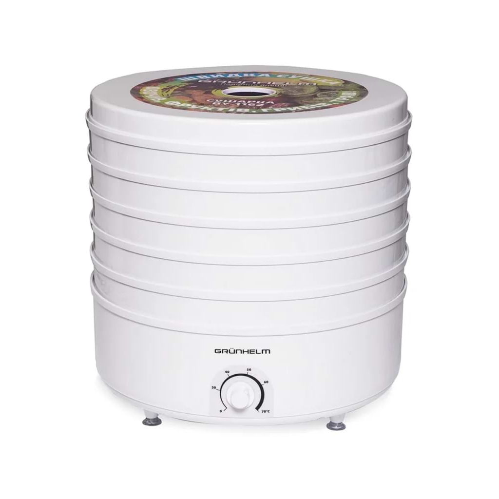 Сушарка GRUNHELM  - ідеальний пристрій для тих, хто піклується про заготівлю продуктів на зиму. Це один із найбільш ефективних, простих й економічних сушильних агрегатів. Має захист від перегріву, завдяки вбудованому мікропроцесору. З його допомогою можна урізноманітнити свій раціон і піклуватися про здорове харчування круглий рік. Висока потужність двигуна та вентилятора дають змогу висушувати продукти тривалий час без вимикання.