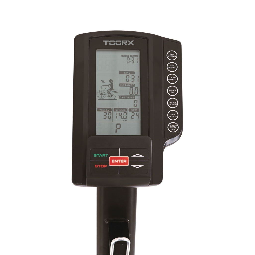 - Інформативна консоль: LCD-дисплей відображає час, дистанцію, калорії, швидкість, пульс, оберти за хвилину, ЧСС та потужність; в комплекті є тримач для смартфона або планшета.