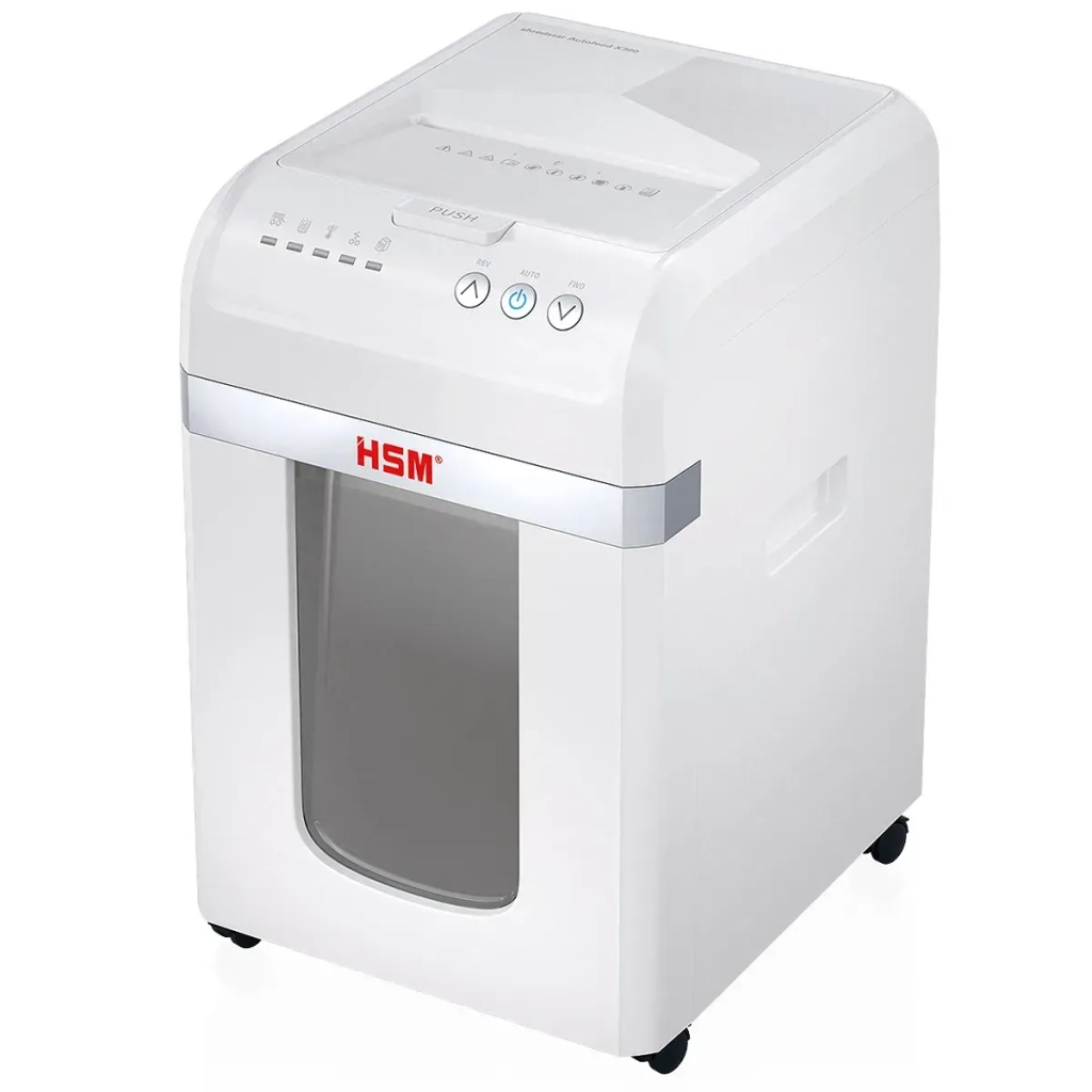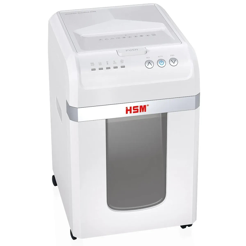 Знищувач документів офісної серії с автоподаванням. Перехресна різка, 4-й рівень секретності, розмір фрагментів 4х12 мм. Знищує у режимі автоподаванні до 300 аркушів паперу (80 г/м2). Знищує одночасно до 14 аркушів паперу (70 г/м2). Приймає документи, скріплені скобами або скріпками. Можливість знищення пластикових карт. Автоматичний старт/стоп, автоматичний реверс. Об'єм кошика для відходів 30 л. Низький рівень шуму. Термозахист двигуна від перегріву. ТМ HSM - преміум-клас, системи знищення та утилізації документів, дисків, пластикових карт та інших носіїв інформації! Зроблено в Німеччині!