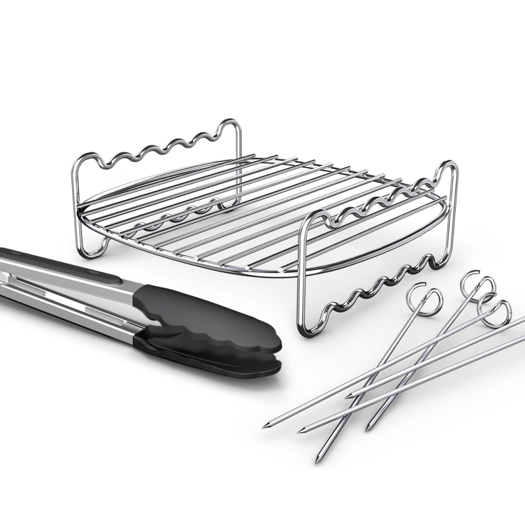 Благодаря двухуровневой решетке, 5 шампурам и щипцам вы сможете легко, быстро и с пользой для здоровья приготовить на гриле или во фритюре вкусные бургеры, куриные крылышки, рыбу и многое другое. Легко вынимайте пищу с помощью удобных силиконовых щипцов.