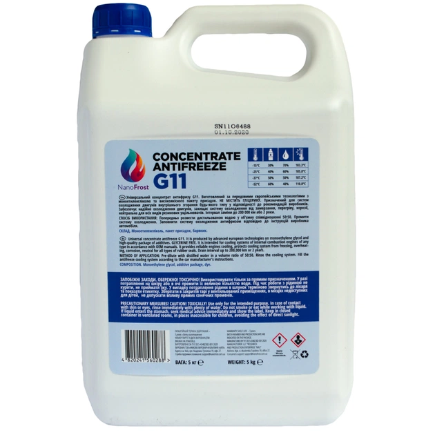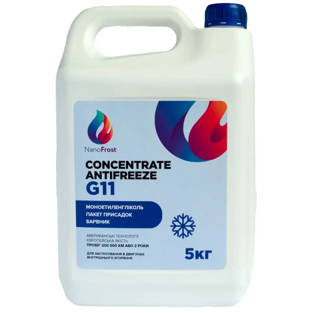 Антифриз NanoFrost G11 синий, 5 кг — это концентрат охлаждающей жидкости, разработанный для обеспечения надежной работы двигателей легковых и грузовых автомобилей. Отличается высококачественной основой из моноэтиленгликоля, дополненной активными присадками, что гарантирует эффективную антикоррозийную защиту и долговечность деталей из чугуна и алюминия без использования фосфатов, аминов и нитратов, обеспечивая экологичность продукта.
