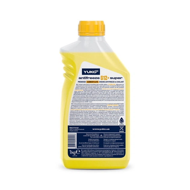 Антифриз Yuko -32 Super G12+ жёлтого цвета — ваш идеальный выбор для надежной защиты автомобильного двигателя в разнообразных климатических условиях. С классом G12+ этот продукт обеспечивает стабильность системы охлаждения благодаря тщательно подобранной формуле, которая включает основу из моноэтиленгликоля и специальные антикоррозийные присадки от BASF. Температура замерзания до -32 °C гарантирует уверенность, что ваш автомобиль будет готов встретить суровые зимние условия без риска замерзания.