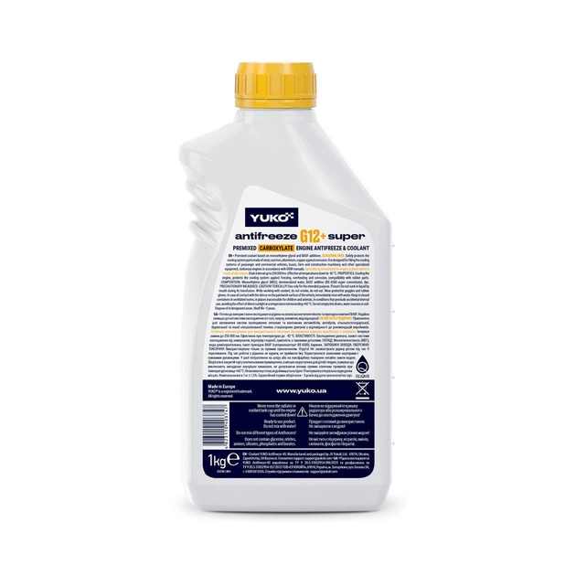 Антифриз Yuko -40°C Super G12+ Жёлтый — это надёжное и высококачественное решение для охлаждения современных бензиновых и дизельных двигателей. Благодаря своему привлекательному жёлтому цвету и соответствию классу G12+, он не только защищает ваш двигатель от замерзания при температуре до -40°C, но и устраняет риски перегрева, коррозии и опасных отложений.
