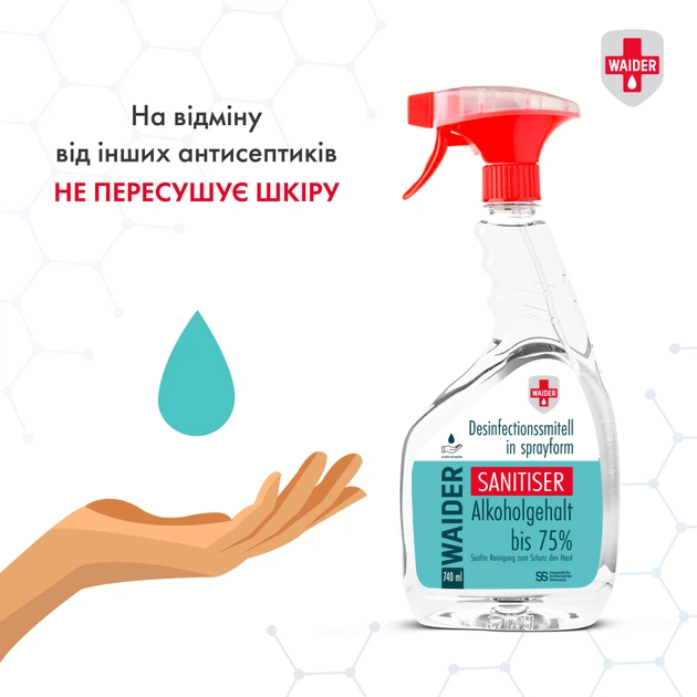 Дезинфектор для твердых поверхностей и кожи от Waider подходит для обработки любых предметов, помещений, ведь он: