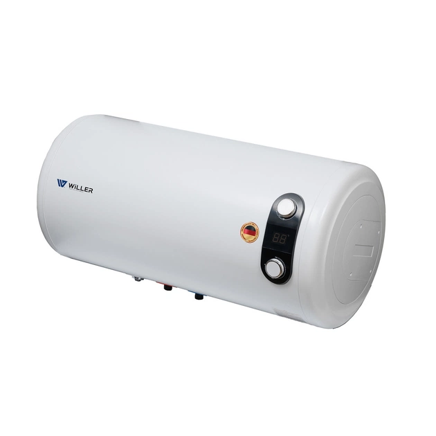 Willer EH80RI HORIZON - надійний накопичувальний електричний бойлер циліндричної форми об'ємом 80 літрів з горизонтальним розташуванням. Оснащений подвійним зануреним (мокрим) нагрівальним елементом загальною потужністю 2,0 кВт. Внутрішній бак, виготовлений зі сталі, покритої титанокварцевою емаллю, і збільшений захисний магнієвий анод забезпечують тривалий термін експлуатації. Призначений для встановлення в місцях, де недостатньо місця для вертикальних бойлерів та під стелею.
