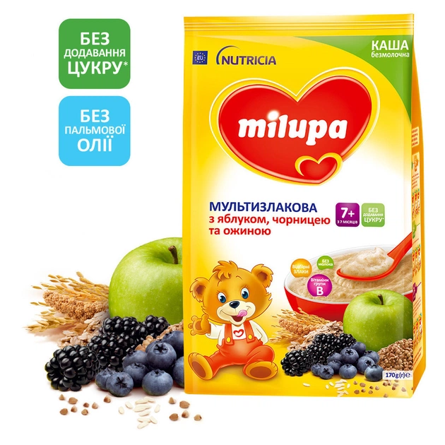 В безмолочной каше Milupa "Мультизлаковая с яблоком, черникой и ежевикой" собрана польза 7 злаков: пшеницы, овсянки, ржи, проса, риса, гречки и спельты.