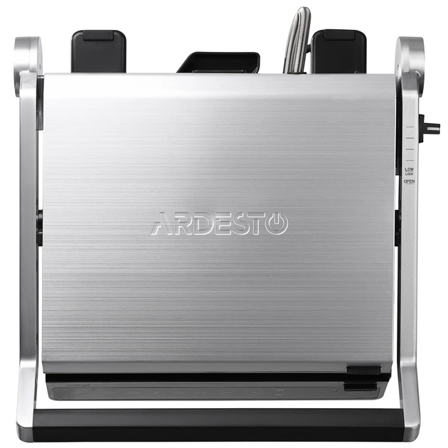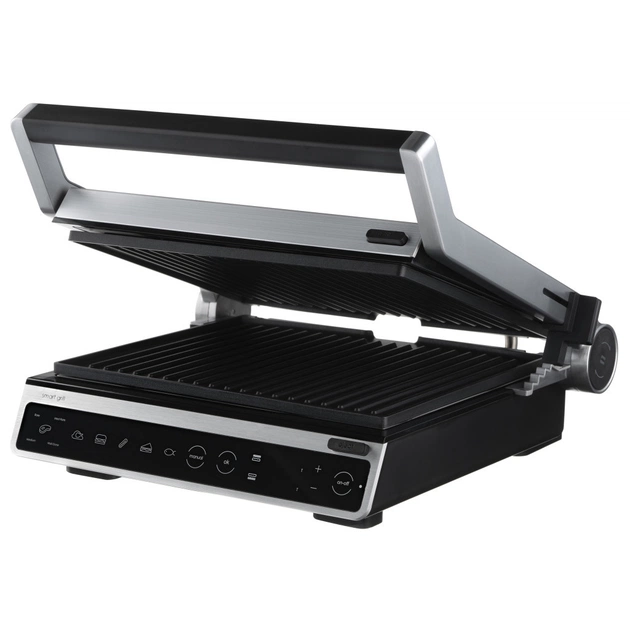 Электрогриль мощностью 2000 Вт, с сенсорным управлением, шестью автоматическими режимами приготовления, регулировкой температуры, степенью прожарки и готовности, а также автоматическим определением толщины продукта. Полное раскрытие пластин конструкции позволяет использовать обе поверхности для одновременного приготовления продуктов, с возможностью отдельной установки температуры для каждой пластины. Съемные пластины с антипригарным покрытием и лоток для сбора жира и других отходов обеспечивают удобную и простую очистку и мытье устройства.