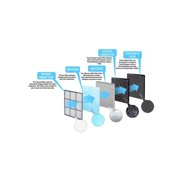 - Система фильтрации: 5-ступенчатая (первичный фильтр, предварительный фильтр, фильтр с активированным углем, HEPA H13, холодный катализатор)