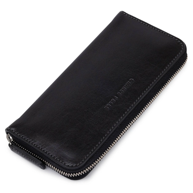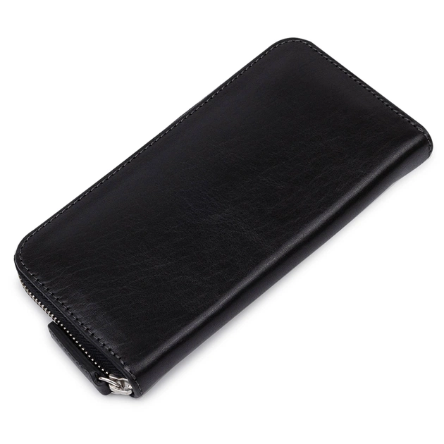 Отличный вместительный кошелек на молнии из натуральной высококачественной кожи. Имеет красивый черный цвет и гладкую фактуру. Внутреннее наполнение хорошо продумано и практично, в нем поместятся купюры, монеты, различные карты и многое другое.