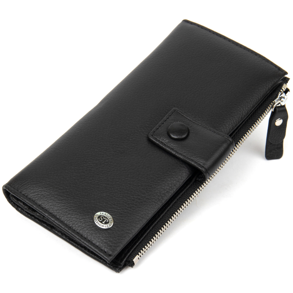 Красивый и функциональный кошелек-клатч в классическом черном цвете. Выполнен из натуральной кожи высокого качества, имеет матовую зернистую фактуру и очень приятный на ощупь, что немаловажно при каждодневном использовании. Внутри имеет богатое наполнение в виде множества карманов и отделений, также есть внешняя монетница на молнии.