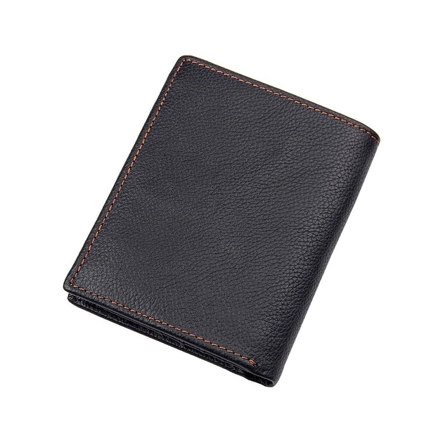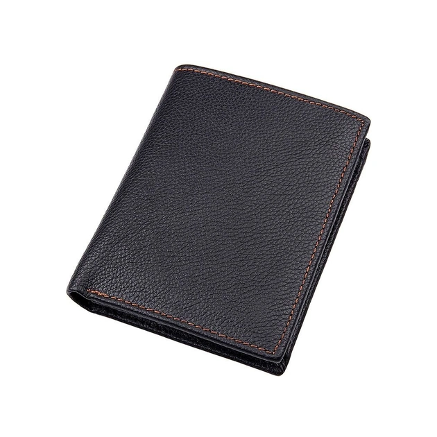 Стильный мужской кожаный бумажник черного цвета. Аксессуар аккуратно прошит сверхпрочной нитью светло-коричневого цвета, что придаёт ему изюминку.