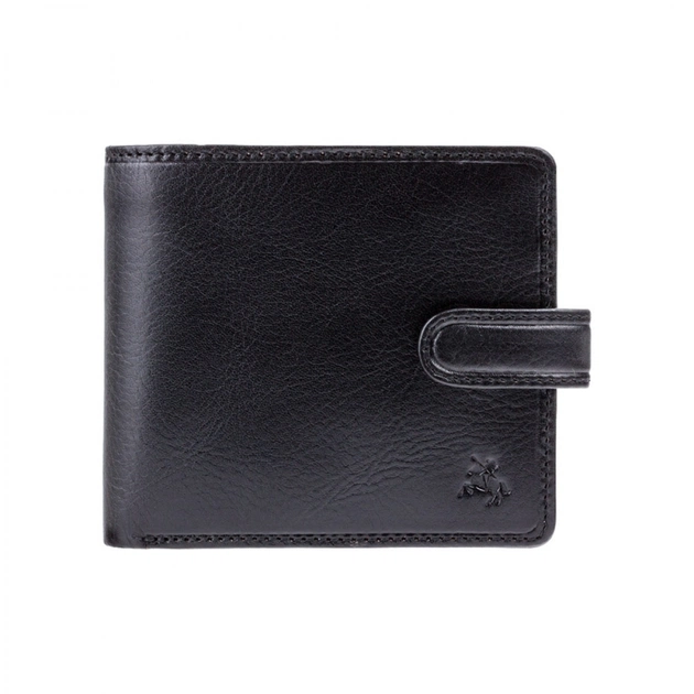 Мужской кошелек из мягкой и крепкой телячьей кожи черного цвета. Модель имеет защиту от считывания пластиковых карт с RFID-чипами, что защитит ваши банковские дебетовые и кредитные карты от несанкционированного доступа. По внешнему и внутреннему периметру кошелек прошит крепкой капроновой нитью. На коже выдавлен фирменный логотип Visconti (тиснение золотым цветом). Кошелек компактен и имеет минимальное количество отделений для карт, купюр и прав. Без отделения для мелочи. Закрывается на застежку с кнопкой.
