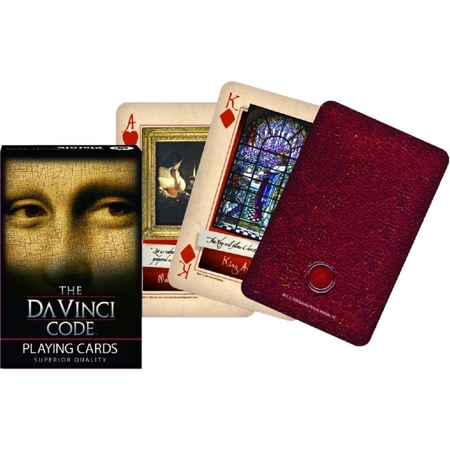 Игральные карты Код да Винчи – сувенирные карты, рубашка красного цвета. Карты сделаны из высококачественного картона с ламинированием. Ламинирование улучшает скольжение и долговечность карт. Прекрасно подходят для любительской игры. Размер карт идеален для игры в бридж, также подходят для других игр в карты. Колода состоит из 52 основных карт, 2-х джокеров и промокарты.
