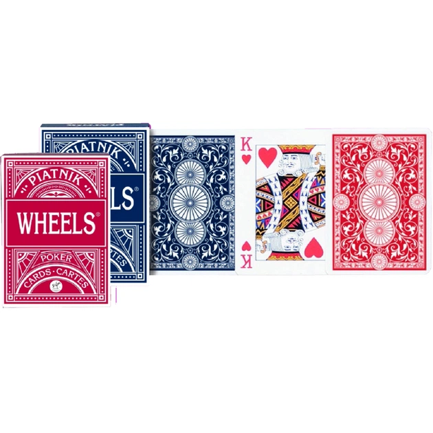 Игральные карты Колеса – стандартная колода, которую можно использовать для любых карточных игр. Карты сделаны из высококачественного картона с ламинированием. Ламинирование улучшает скольжение и долговечность карт. Рубашка может быть в красном или синем цвете. Размер карт стандартный, они идеально подходят для любых карточных игр. Колода состоит из 52 основных карт, 2-х джокеров и промокарты.
