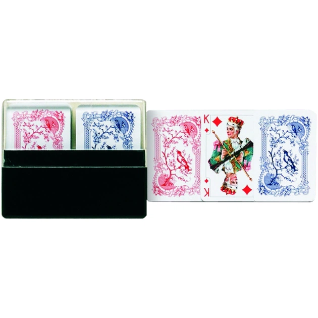 Карты для пасьянса Piatnik Mini Patience – это комплект для разложения пасьянсов. В него входят два миниатюрных бревна по 55 карт размером 30 х 43 мм. Карты можно использовать как для пасьянса, так и для любых карточных игр. Карты Piatnik Mini Patience имеют изысканный дизайн на лицевой стороне. На рубашке изображены птички на дереве, рубашка в двух цветах – синем и красном. Игральные карты изготовлены из картона с пластиковым покрытием. Этот материал удобен в использовании и долговечен. Бревна упакованы в подарочную коробку.