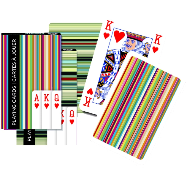 Игральные карты Полоски – стандартная колода, которую можно использовать для любых карточных игр, но лучше подойдет для игры в бридж. Карты сделаны из высококачественного картона с ламинированием. Ламинирование улучшает скольжение и долговечность карт. Рубашка – разноцветные полоски в красных и серых тонах. Размер карт идеален для игры в бридж, также подходят для других игр в карты. Колода состоит из 52 основных карт, 2-х джокеров и промокарты.