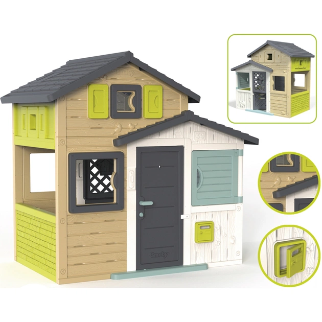 Развлечения и игры в вашем первом доме. Благодаря своей гармоничной и модной цветовой гамме дом Друзья Эво привлекает внимание в каждом саду. Очень просторный игровой домик высотой 1.60 м является не только идеальным местом для игр малышей от 3 лет, но и прекрасным для детей постарше.
