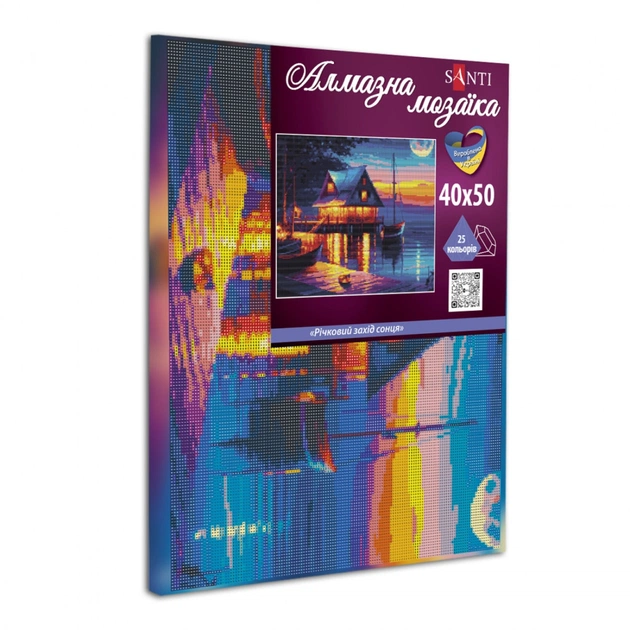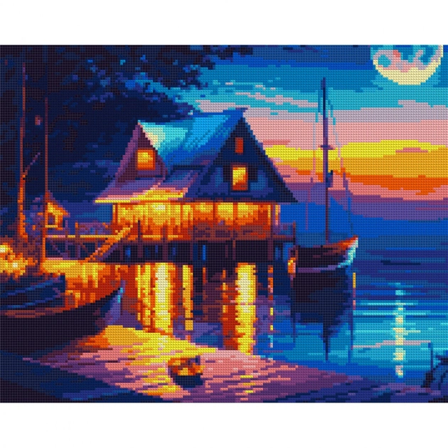Алмазная мозаика SANTI Речной закат. Уютный домик на берегу, ласково плещущаяся лодка, сверкающие огни, легкие волны качают мостик.