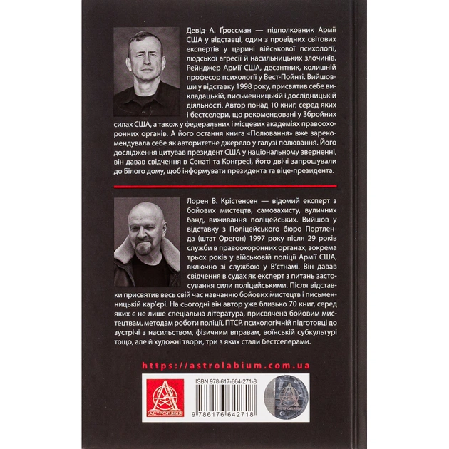 Що відбувається з людським тілом під впливом стресу в умовах смертельного зіткнення? А з нервовою системою, серцем, диханням, зором та слухом, з пам’яттю? Що потрібно сучасним воїнам, щоб не дійти до нервового виснаження і продовжувати боротьбу, щоб вижити й перемогти? На ці та інші запитання, що постають перед учасниками бойових дій та правоохоронцями, дають відповідь автори цієї книги: підполковник Дейв Ґроссман — колишній рейнджер Армії США, викладач психології Вест-Пойнту, та Лорен Крістенсен — досвідчений поліцейський, ветеран війни у В’єтнамі. Читач дізнається про психологічну еволюцію бойових дій; про розвиток технік, які сприяють ефективності військовослужбовців та їхній психологічній витривалості й допомагають вийти з токсичного середовища смертоносних боїв зміцнілими тілом та духом. Книга входить до переліку рекомендованої літератури у Військовій академії США та Академії ФБР.
