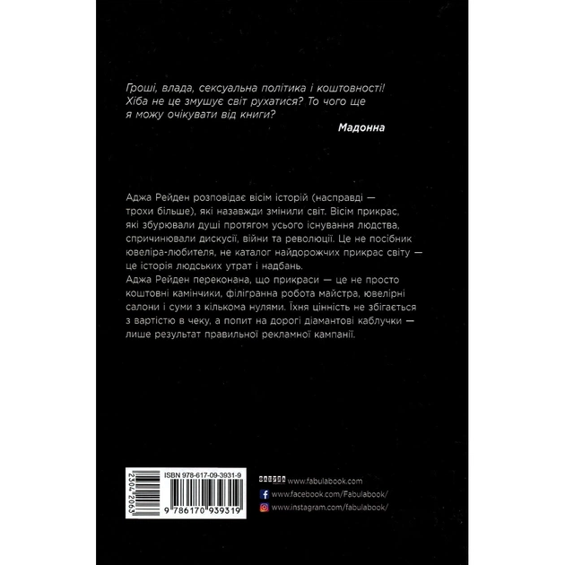 Задумывались ли вы о том, почему на помолвку традиционно дарят обручальное кольцо с бриллиантом, а жемчужины ассоциируются с богатством и аристократизмом? Слышали ли когда-нибудь об Испанской Армаде и Эльдорадо? Знали, что наручные часы поначалу были женским аксессуаром? Нет? Это эта книга для вас. Аджа Рейден в невероятно иронической манере отвечает на эти и другие вопросы, рассказывая, как формируется цена и ценность драгоценностей и действительно ли они так дороги.