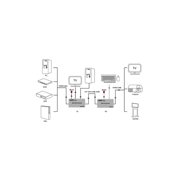 Расширитель HDMI использует один кабель Ethernet (Cat5e или Cat6) вместо кабеля HDMI для передачи видео и аудио сигналов высокой четкости на расстояние до 200 метров. Используя переключатель, это устройство может распределять сигнал по отдельным приемникам (функция point-to-multipoint).