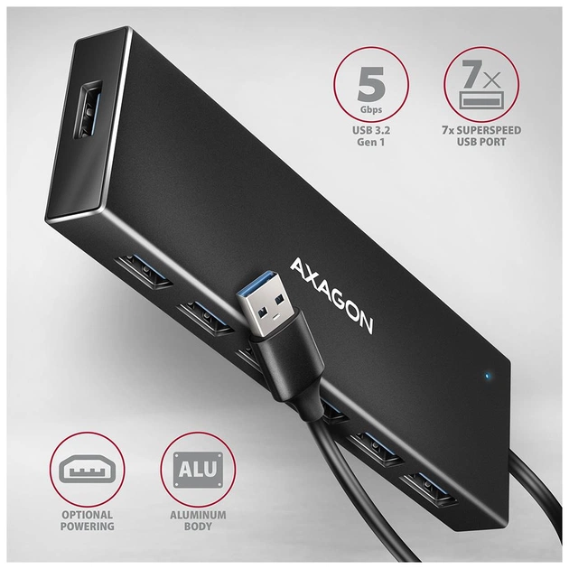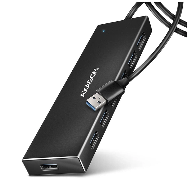 AXAGON HUE-F7A — це надійний і високопродуктивний USB-хаб із семи портів, який створено для користувачів, що потребують стабільного підключення численних пристроїв одночасно. Завдяки підтримці стандарту USB 3.2 Gen 1 він забезпечує швидкість передачі даних до 5 Гбіт/с і підходить як для настільних ПК, так і для ноутбуків. Це рішення ідеально поєднує продуктивність, довговічність і стиль, дозволяючи ефективно організувати робоче місце без зайвих адаптерів і перехідників.