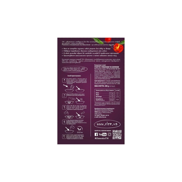 Преимущества ризотто с томатами и базиликом Жменька™В упаковке находится уже готовая идея для завтрака, обеда или ужина: