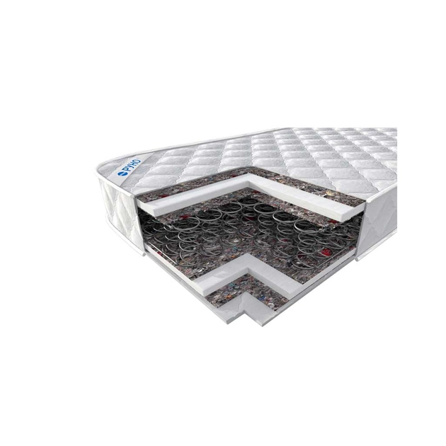 - Сторона Лето: Стеганое полотно (микрофайбер + нетканное полотно ХБ плотностью 150 г/м² + синтепон 200 г/м² + спанбонд 17 г/м²), войлок – изолятор, пенополиуретан толщиной 2 см, войлок – изолятор, пружинный блок типа "Боннель".