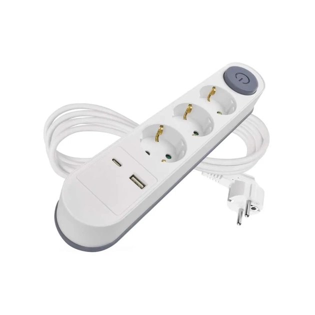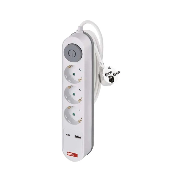 Сетевой удлинитель P1322PD от чешского производителя Emos. Отличное и качественное решение для подключения электроприборов, которые находятся далеко от розетки. Корпус изготовлен в современном дизайне, основной визуальной особенностью является большая тактильная кнопка включения, которая срабатывает при нажатии на нее внутрь. Также есть заглушки для обеспечения защиты от детей. Данный удлинитель позволяет осуществлять быструю (18W) зарядку мобильных устройств и гаджетов, просто подключая кабель USB к коннекторам удлинителя (1 x USB-A + 1 х USB-C). Изоляция изготовлена из ПВХ, сечение кабеля 1.5 мм². Отличное решение для подключения домашних бытовых приборов с нагрузкой до 3680 Вт.