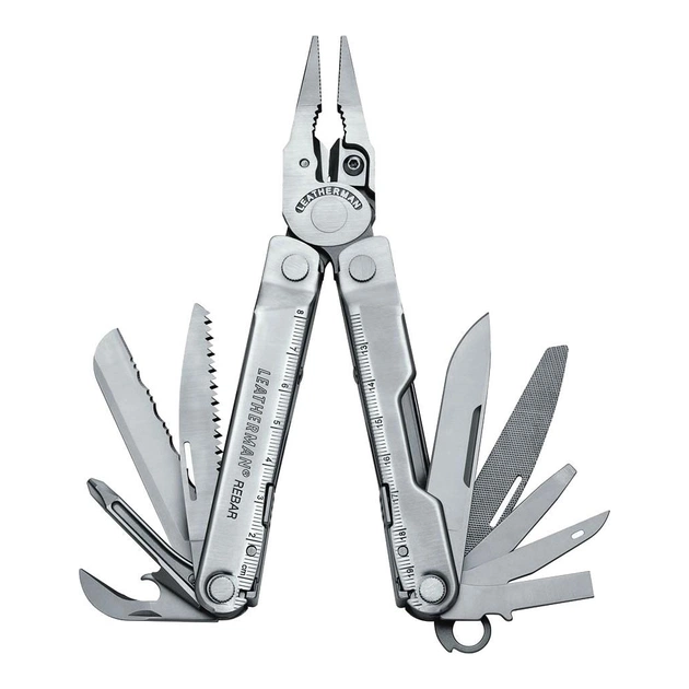 Leatherman Rebar Stainless Steel с чехлом состоит из множества утилит, аккуратно спрятанных в рукоятках пассатижей, формируя удобную для переноски и хранения компактную конструкцию, что особенно ценно для путешественников. Он легко поместится не только в кармане, рюкзаке или сумке, но и в ящике для инструментов, на рабочем столе или в домашней мастерской. Основным элементом являются многофункциональные щипцы с высокой прочностью и возможностью замены лезвий кусачек. Это мультиинструмент с четырехдюймовыми плоскогубцами для арматуры, которые были специально усилены и оснащены сменными кусачками для проволоки и жесткой проволоки. В дополнение к обычным комбинированным плоскогубцам, в комплекте включены два прямых и зубчатых лезвия из нержавеющей стали 420HC, пила, линейка, шило, набор открывашек для банок и бутылок, напильник для обработки дерева и металла, а также комплект отверток.