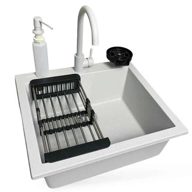 Набор Adamant Univer сочетает мойку из искусственного камня, смеситель, дозатор, ополаскиватель для стаканов и коландер. Квадратная форма и отсутствие крыла помогают эффективно использовать пространство кухни. Технология Solid Surface придает поверхности прочность, устойчивость к повреждениям и простоту в уходе. Наличие дополнительных аксессуаров делает ежедневные задачи удобнее и аккуратнее. Комплект подойдет тем, кто выбирает практичность и современный подход к оснащению кухни.