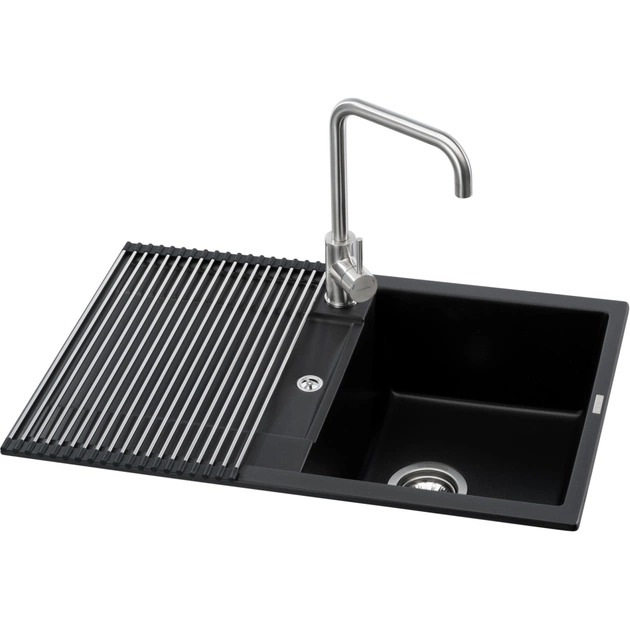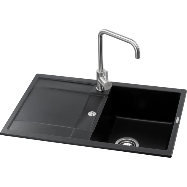 Мойка изготовлена из качественного гранита, устойчивого к царапинам, высоким температурам и воздействию бытовой химии. Черное глянцевое покрытие придает элегантности и легко сочетается с интерьером современной кухни. Просторная чаша и дополнительное крыло обеспечивают комфорт в повседневном использовании, а смеситель с плавным управлением позволяет удобно регулировать поток и температуру воды.